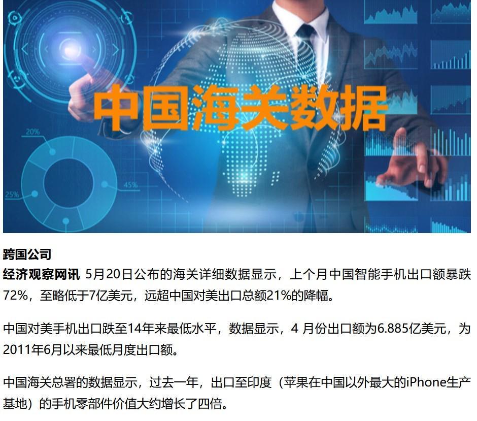 今年4月份,我国智能手机出口额暴跌72,%,尤其是对美国的出口已经跌至14年来最低水平。4月份的出口额仅为6.885亿美元,这是自2011年6月以来最低月度的出口额。
