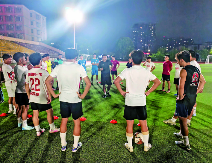 当天晚上,湘潭县一中绿茵场上,“湘超”湘潭队训练如约进行。在教练员的指导下,球员们有计划地开展体能训练、对抗训练等,教练与球员之间、球员之间的默契进一步提升。一旁,5名训练助理正在准备训练器材、捡球、运水等,为训练提供贴心的后勤保障。